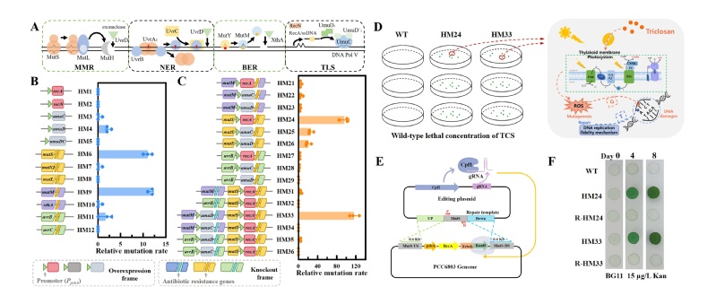 图片说明:A. DNA复制保真度相关机制和所选操作组件的示意图;B. 单点/组合策略示意图; C. 基因修饰转化体的相对突变率;D. 调节转化体TCS耐受性的假设机制模型;E. 基于CRISPR-Cpf1的突变互补策略示意图;F. 互补菌株的表型鉴定